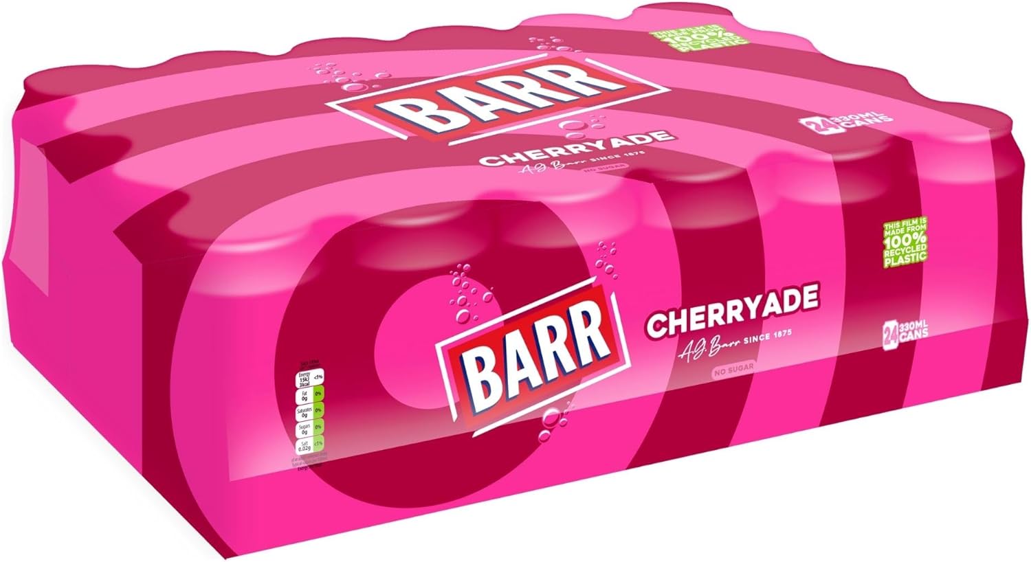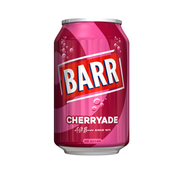 Buy Barr Cherryade 24 x 330ml cans – sweet cherry-flavoured fizzy drink, sugar-free, vegan-friendly. Perfect for parties or everyday refreshment.